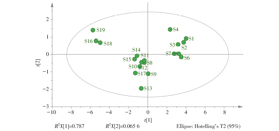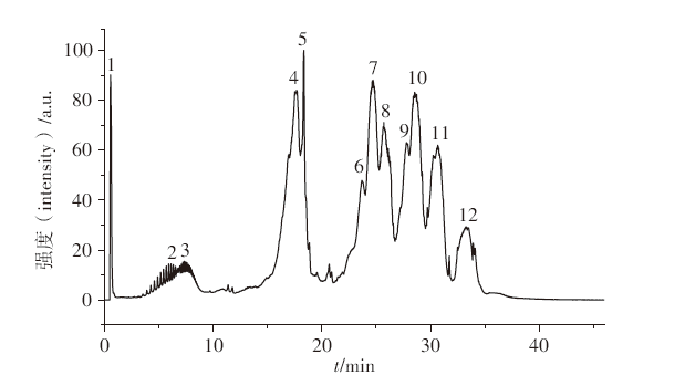 目的: 建立青白通痹胶囊的指纹图谱,结合化学计量学和网络药理学方法,分析预测青白通痹胶囊潜在的质量标志物(Q-Marker),并对Q-Marker成分进行含量测定,为其质量控制提供参考。方法: 采用Agilent 5 TC-C18(250 mm×4.6 mm,5 μm)色谱柱,以乙腈(A)-0.1%磷酸水溶液(B)为流动相,梯度洗脱,流速1.0 mL · min-1,柱温30 ℃,进样体积10 µL,紫外检测波长210 nm(0~45 min)、260 nm(45~70 min),建立指纹图谱并确定共有峰,通过与对照品相对保留时间及紫外光谱的比对进行色谱峰对应化合物的指认,经单煎液对各共有峰进行归属。采用化学计量法对10批青白通痹胶囊进行质量评价,借助正交偏最小二乘-判别分析(OPLS-DA)分析筛选青白通痹胶囊的主要差异性标志物;结合网络药理学,通过相应数据库筛选差异性标志物的核心靶点和关键通路,构建“成分-靶点-通路”网络图,结合上述结果筛选可用于预测青白通痹胶囊的Q-Marker,并建立对预测得到的标志性成分进行含量测定的HPLC方法。结果: 建立了青白通痹胶囊的HPLC指纹图谱,标记24个共有峰,对其进行峰归属,其中1~3、5~8、10~11、13、16号峰来自青风藤,4、9、12、14、16、18~19号峰来自白芍,15、17、20~24号峰来自炙甘草,并指认了其中的8个共有峰,分别为儿茶素、青藤碱、没食子酸、木兰花碱、芍药苷、甘草苷、1,2,3,4,6-O-五没食子酰葡萄糖、甘草酸。相似度评价显示,10批青白通痹胶囊样品的相似度为0.934~1.000。主成分分析(PCA)显示前4个主成分的累积方差贡献率为93.998%,OPLS-DA显示有8个成分变量重要性投影(VIP)值较大。采用网络药理学的方法分析得出儿茶素、青藤碱等活性成分可能通过37个核心靶点、10条主要通路发挥药效作用,初步筛选儿茶素、青藤碱、没食子酸、木兰花碱、芍药苷、甘草苷、1,2,3,4,6-O-五没食子酰葡萄糖、甘草酸为青白通痹胶囊潜在的Q-Marker。同时测定这8个成分的含量,方法学考察结果良好,平均加样回收率为96.81%~103.44%,RSD为0.6%~3.7%。10批样品中儿茶素、青藤碱、没食子酸、木兰花碱、芍药苷、甘草苷、1,2,3,4,6-O-五没食子酰葡萄糖、甘草酸的质量分数分别为0.907 1~1.189 3、2.183 3~3.118 6、 0.397 0~1.427 6、3.507 9~5.446 6、14.207 7~19.570 1、1.412 8~3.577 5、0.442 0~1.697 7、2.738 8~4.761 2 mg · g-1。结论: 本研究建立的青白通痹胶囊指纹图谱方法简单,重复性好,筛选的指标性成分将为青白通痹胶囊的质量控制提供依据。